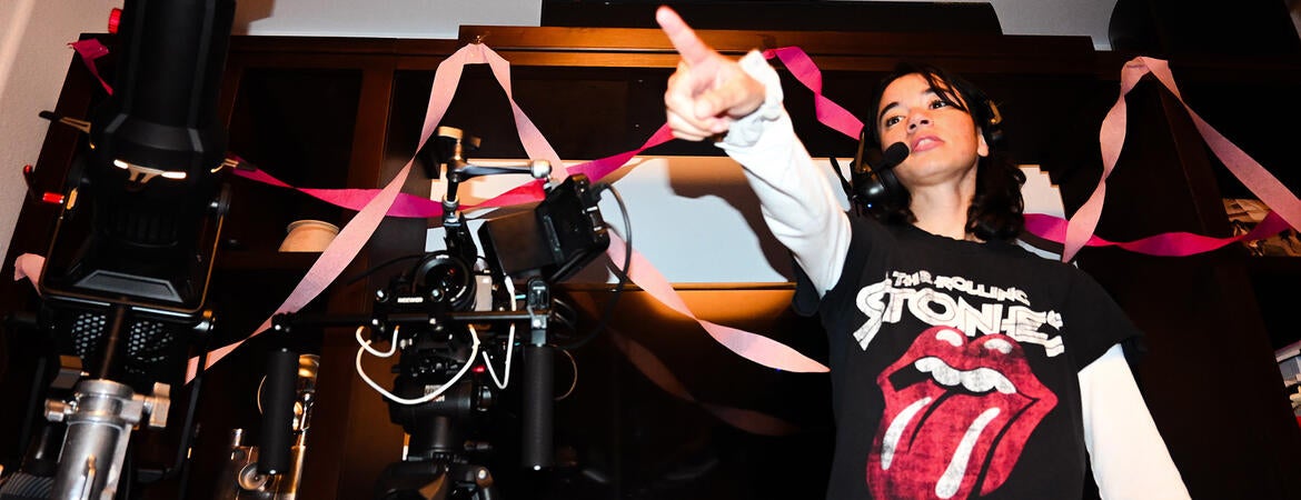 FEATURED PHOTO. Mary Gutierrez '25, director of photography for Camphor Pictures' third short film, points something out to the crew. Photo by Gianna Cosenza